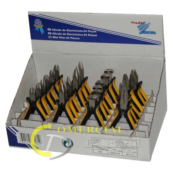 Expositor de 24 alicates de electricista cromo-vanadio, 1,87 €/Unidad, IVA no incluido. Especificaciones: Expositor 24 piezas.